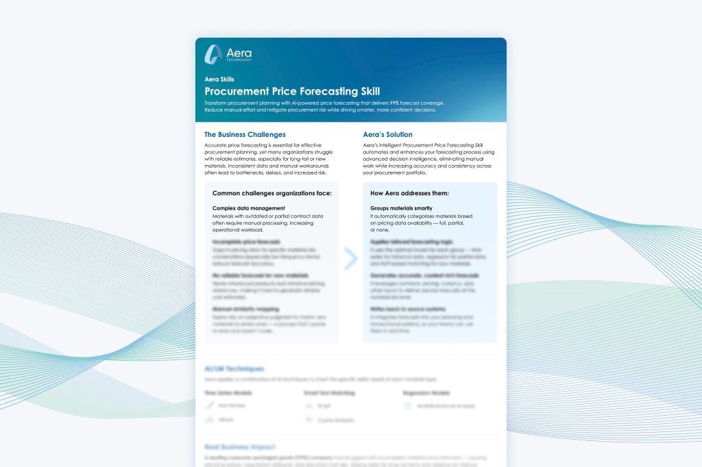 For more on how Aera can help you achieve comprehensive forecast coverage, eliminate manual effort, and reduce procurement risk, download the Procurement Price Forecasting Skill brief or schedule a demo.